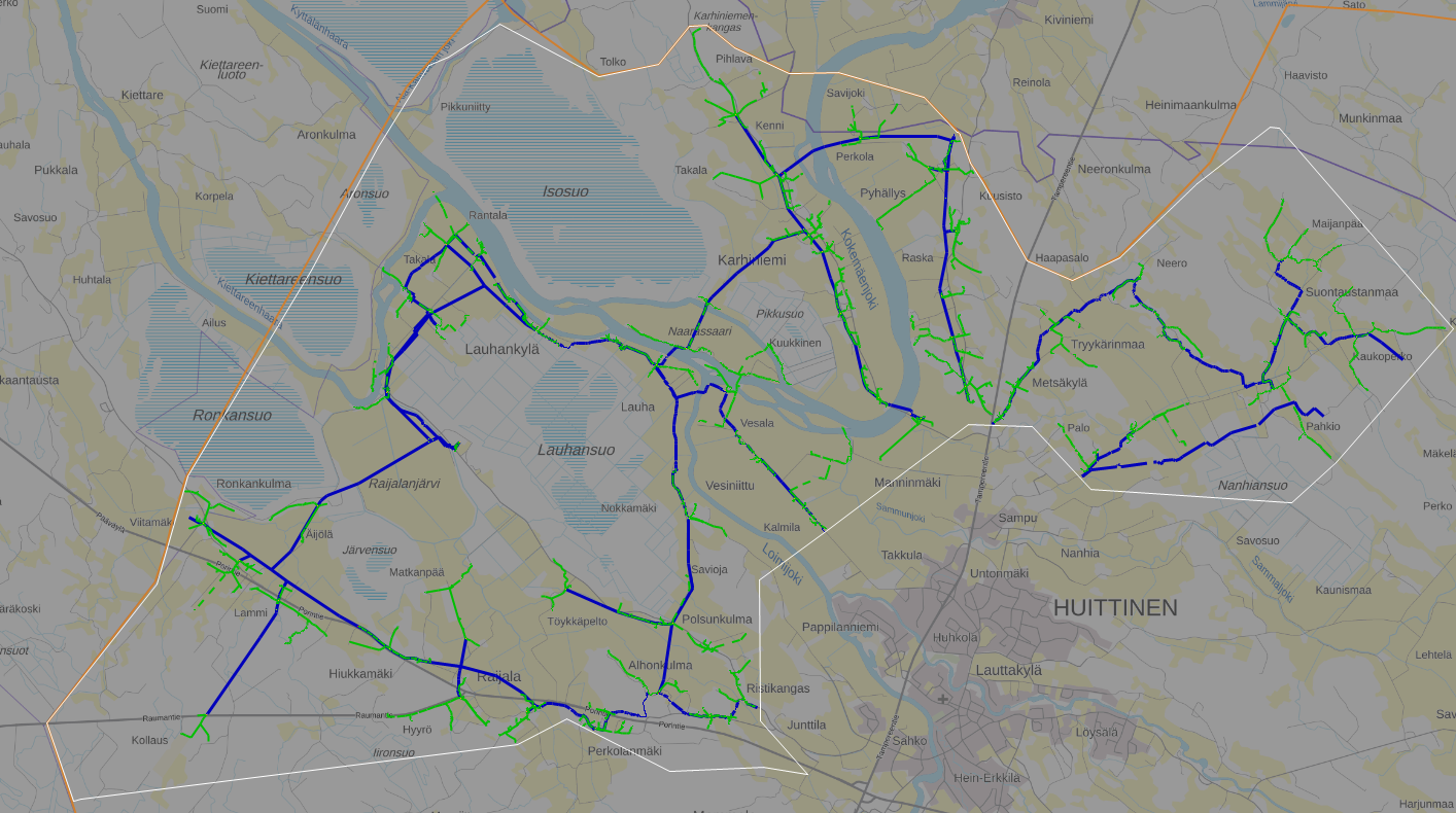 Lokakuun lopun ja marraskuun aikana raivataan 20 kV johtokatuja Huittisissa. Raivausalueet on oheisissa kartoissa merkitty sinisellä värillä.
